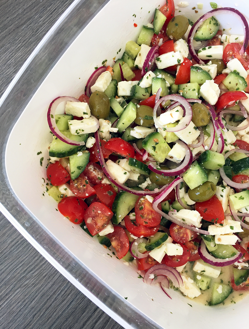 Un classique à ma façon et en version allégée. J’adore le crémeux que donne la feta à la vinaigrette en s’émiettant… Et manger cette salade grecque en ramassant les ingrédients avec un pain pita…le délice! Toute les autres idées de salades par ici.